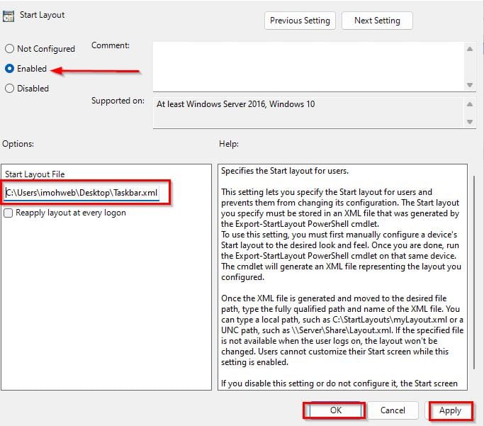 3. Double-click on the Start Layout and select "Enabled". In the Group Policy, you need to point to the “taskbar.xml” file you want the computer to use as shown on the screenshot below.