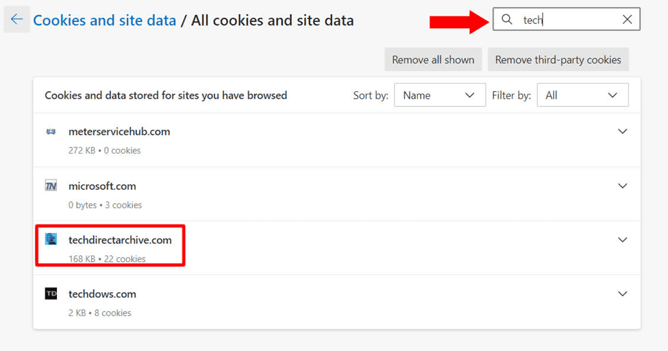 5. The next page will show you the full list of all the stored cookies in your browser. You can search or scroll down to find the site you want to remove the cookies.