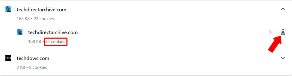 6. After searching the websites you want to delete the cookies, click the dropdown beside it and click the Delete icon next to the cookies you want to remove.