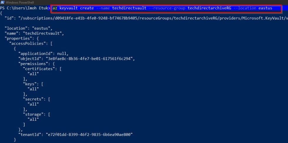 $vaultId=(Get-AzKeyVault -ResourceGroupName techdirectarchiveRG -VaultName techdirectvault12).ResourceId