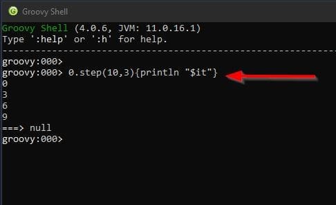 Let’s run the below command to print all numbers (printLn) between 0 and 10 with an increment of 3.