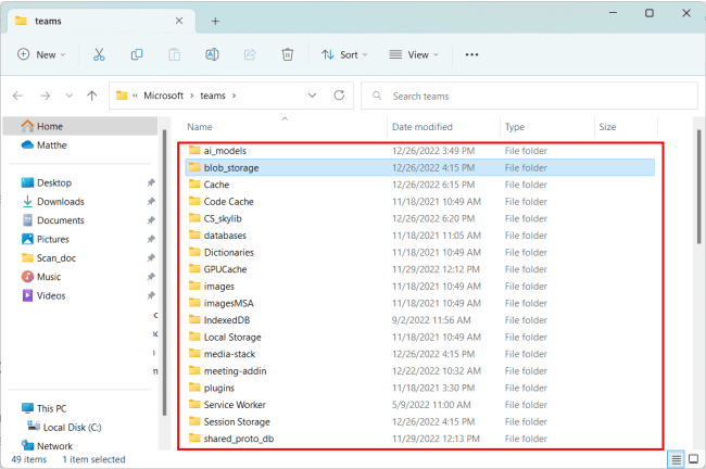 Under the Teams folder, open one-by-one the following folders and delete the contents inside theme: blob_storage, Cache, Databases, GPUCache, IndexedDB, tmp.